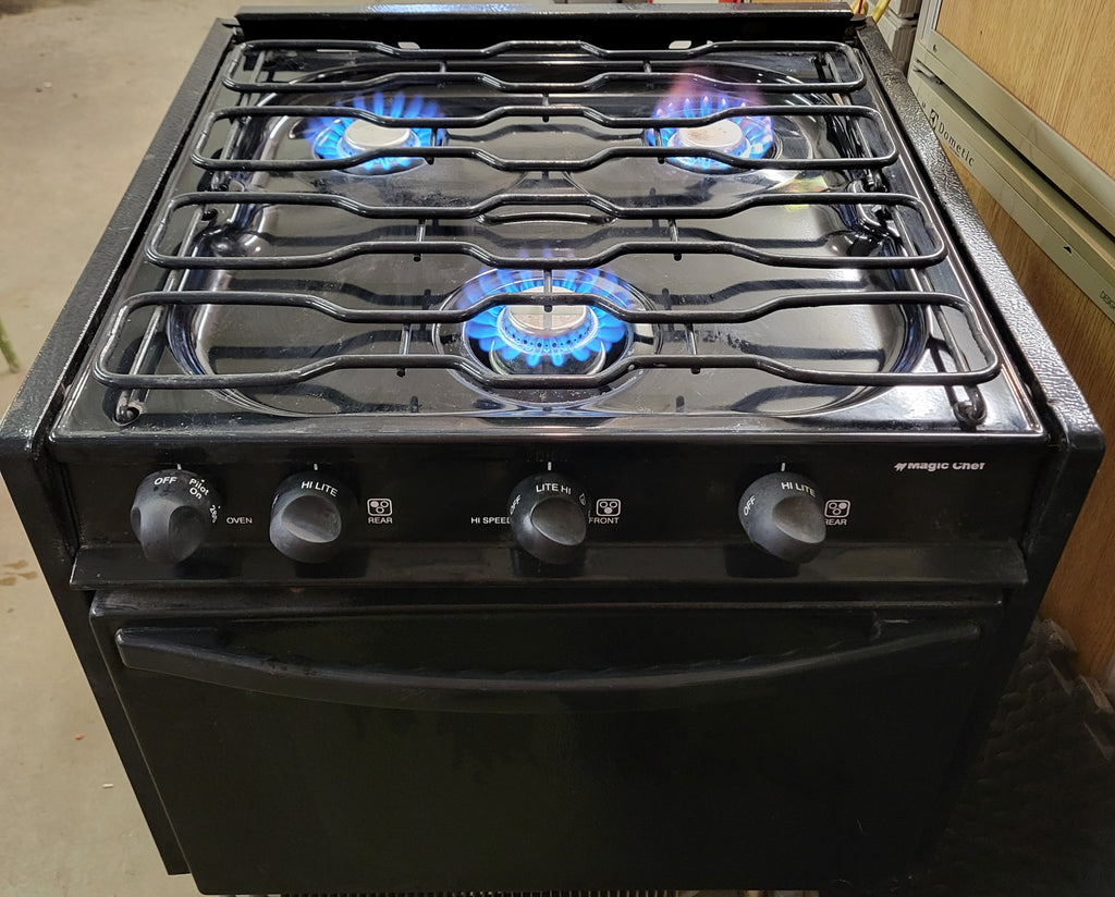 Upgrade your RV kitchen with this used Magic Chef 3-burner propane oven and stove. Fully functional, propane-powered, and compact for easy installation in your RV or camper.