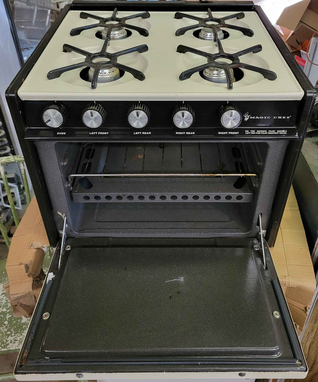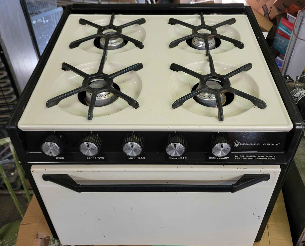 Magic Chef 4-burner RV propane stove and oven – USED, tested and fully functional built-in cooking range designed for RVs, motorhomes, and travel trailers requiring a compact, all-in-one cooktop and oven solution.